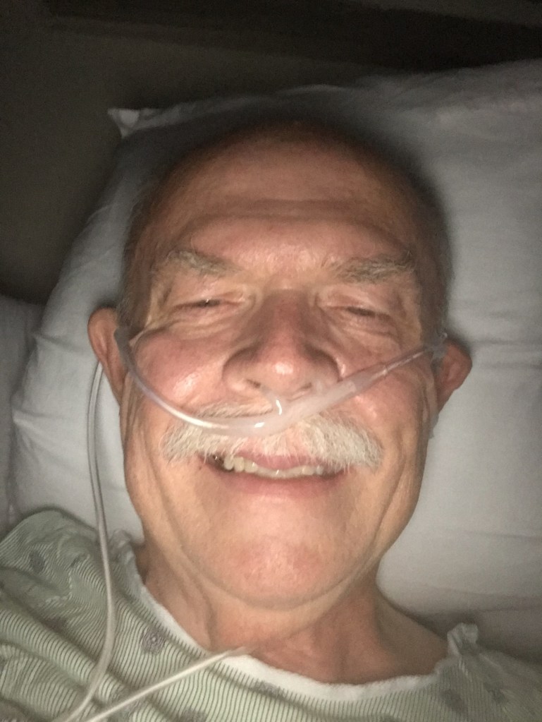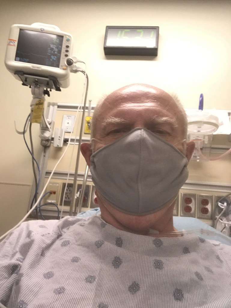 An hour later, the nurse came in to tell me that I had covid pneumonia in both lungs and was being admitted to the hospital. I texted Carol who was waiting in the car because no visitors were allowed in the hospital. “I’ll probably just be here overnight,” I said to reassure her.