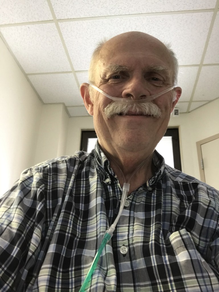 Somewhere around the end of my second week in the hospital, my blood oxygen levels became more stable, and I was switched from the high powered oxygen to regular supplemental oxygen at a flow rate of 5 liters per minute. It still didn’t take much activity to make my O2 levels drop dangerously low. But the regular oxygen equipment was much quieter, and I was able to relax a little. My main doctor said that if I could get weaned down to 4 liters per minute, with O2 level not dropping below 88 percent when active, I could go home.